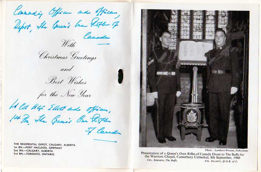 1962 Christmas Card November 25, 2013 860 × 568 1962 Christmas Card Inside of 1962 QOR Christmas Card showing presentation of drum to The Buffs signed by LCol Elliot, 1st Battalion. Share this: Click to email a link to a friend (Opens in new window) Email Click to print (Opens in new window) Print TweetMore Click to share on Telegram (Opens in new window) Telegram Click to share on WhatsApp (Opens in new window) WhatsApp PocketShare on Tumblr Click to share on Reddit (Opens in new window) Reddit Like Loading...