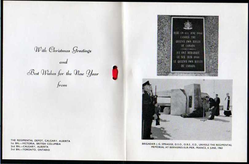 Inside of the 1963 Regimental Christmas Card featuring photos of the unveiling of the Regimental Memorial at Berniere-sur-Mer in June 1963.