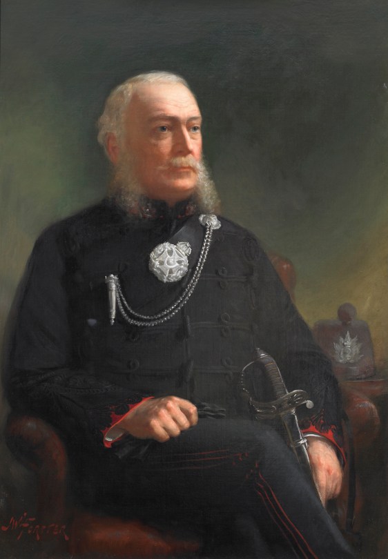 Lieutenant Colonel W.S. Durie – First Commanding Officer, 1860-1866. The original 43″ x 30″ oil on lined canvas painting by celebrated Canadian portrait artist John Wycliffe Lowes Forster, hangs in the Queen’s Own Rifles Officers’ Mess. Photo is by Christopher Lawson, June 17, 2010.