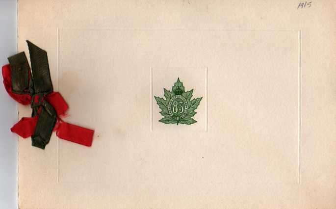 1915 83rd Bn Christmas Card Front November 22, 2013 685 × 426 Regimental Christmas Cards from the First and Second World War Cover of 1915 Christmas card of the 83rd Battalion, CEF Card tied with green and red ribbon Share this: Click to email a link to a friend (Opens in new window) Email Click to print (Opens in new window) Print TweetMore Click to share on Telegram (Opens in new window) Telegram Click to share on WhatsApp (Opens in new window) WhatsApp PocketShare on Tumblr Click to share on Reddit (Opens in new window) Reddit Like Loading...