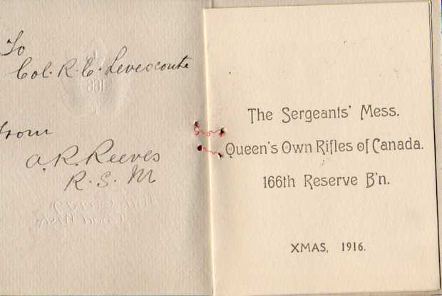 1916 166th Bn Christmas Card Inside A November 22, 2013 620 × 415 Regimental Christmas Cards from the First and Second World War Inside of the 1916 Christmas Card of the 166th Battalion, CEF Sergeants’ Mess To Col R.C. Levesconte from RSM A.R. Reseeves Share this: Click to email a link to a friend (Opens in new window) Email Click to print (Opens in new window) Print TweetMore Click to share on Telegram (Opens in new window) Telegram Click to share on WhatsApp (Opens in new window) WhatsApp PocketShare on Tumblr Click to share on Reddit (Opens in new window) Reddit Like Loading...