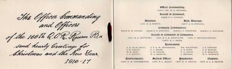 1916 166th Bn Christmas Card November 22, 2013 1096 × 330 Regimental Christmas Cards from the First and Second World War 1916 Christmas Card from the Officer Commanding and Officer’s of the 166th Battalion, CEF Officer cadre and appointments are listed inside the card. Share this: Click to email a link to a friend (Opens in new window) Email Click to print (Opens in new window) Print TweetMore Click to share on Telegram (Opens in new window) Telegram Click to share on WhatsApp (Opens in new window) WhatsApp PocketShare on Tumblr Click to share on Reddit (Opens in new window) Reddit Like Loading...