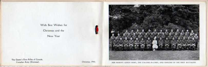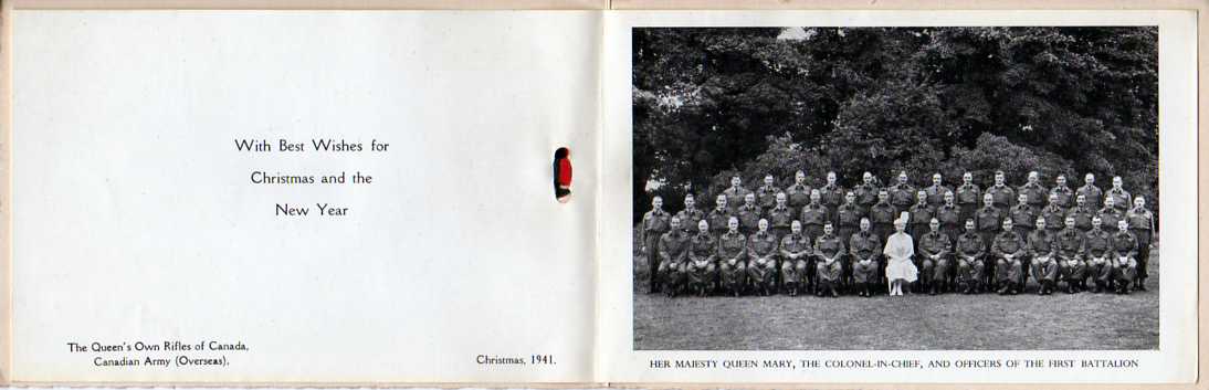 Taken in England in 1941, it includes a formal photograph Queen Mary, Colonel-in-Chief with the Officers of the First Battalion. The simple cover is the pre-WWII battle honours in Rifle Green and the card is tied with a know of green and red ribbon.