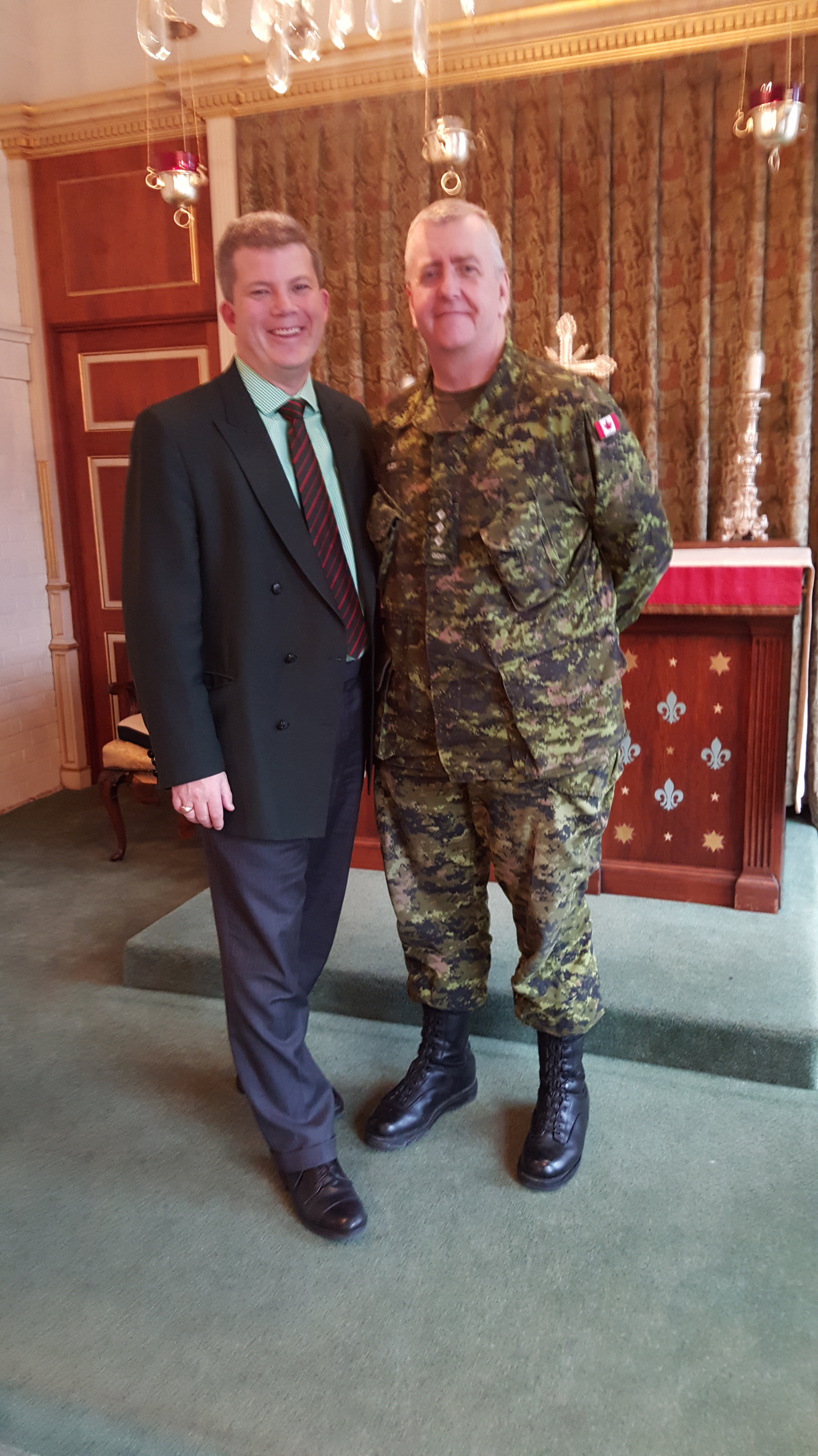 Former QOR Honorary Lieutenant Colonel and UCC Old Boy Brendan Caldwell with QOR Chaplain Captain John Niles after the UCC chapel service on 3 February 2016.