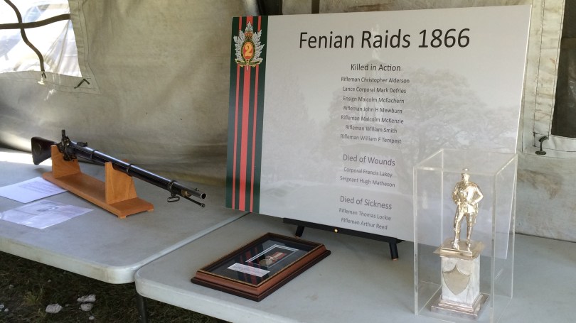 from L-R, Rifleman Mewburn’s P53 Enfield, listing of casualties, Fenian Raid medal, trophy presented to Mrs Pring by officers of the regiment