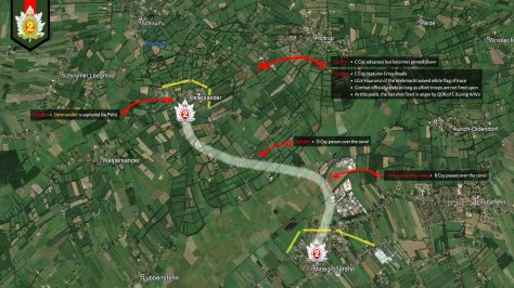24 March and the QORs are on the move again as part of Operation PLUNDER. By 2 April they are back in The Netherlands, they cross the Oude Ijssel river and are getting a taste of liberating the jubilant Dutch population. On 5 April B Company is tasked to capture the hamlet of Pipelure, near Rha. The enemy had used forced labour to dig deep trenches and construct tank traps. The terrain is muddy and the trenches waterlogged. In those horrendous circumstances, without cover and supporting fire, Kavanagh advances with two platoons in the late afternoon and runs in to heavy mortar and small arms fire and is pinned down. During that action Jack is killed, it is said by a Panzerfaust, an anti-tank weapon. Four others die in the same action. The reserve platoon is now deployed to allow platoons 11 and 12 to withdraw. In the dwindling light The Queen’s Own have to fight hand to hand with the enemy before they can retire taking their wounded but leaving five dead, including Jack, behind.