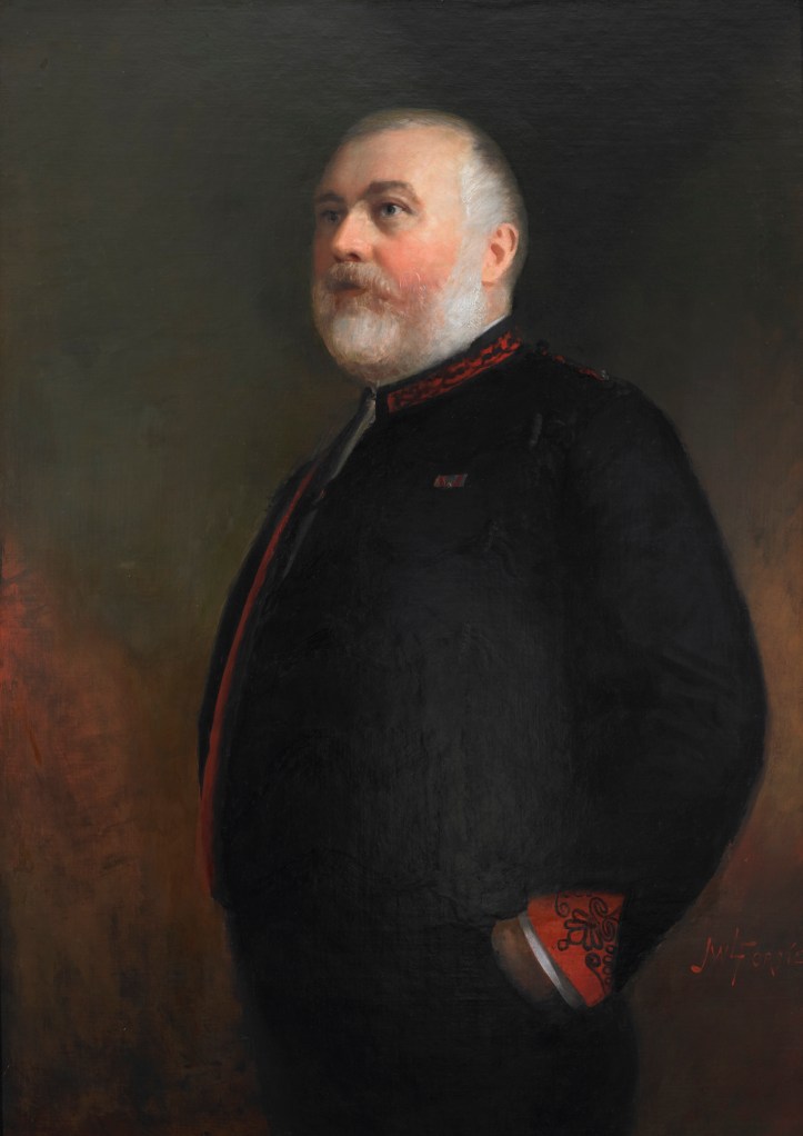 General Sir William D. Otter – Third Commanding Officer, 1875-1883 and Honorary Colonel, 1915-1929. The original 43″ x 30″ oil on canvas mounted onto panel painting by celebrated Canadian portrait artist John Wycliffe Lowes Forster, hangs in the Queen’s Own Rifles’ Officers’ Mess. Photo by Christopher Lawson, June 17, 2010.