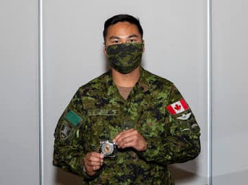 June 8th – Master Corporal Valentin Costache and Cpl Edward Tsoi are presented with the command coin from Major-General Andrew Downes, Surgeon General and Commander of Canadian Forces Health Services Group at the Delta Hotels by Marriott Toronto East. Master Corporal Costache and Cpl Tsoi received the coin for their work setting up new operating procedures to allow the teams of soldiers and medics to stay mission orientated during Operation LASER where Canadian soldiers and medics provided assistance at long term care facilities. Toronto, Ontario, 8 June 2020. Corporal Justin Dremanis, 4th Canadian Division Headquarters Public Affairs.
