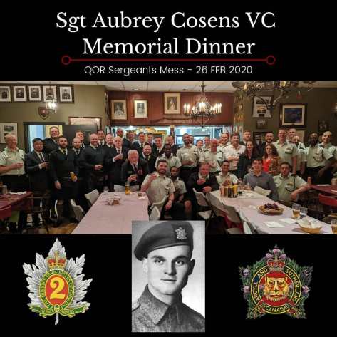 February 26th – Last night the QOR Sergeants’ Mess hosted our annual memorial dinner for Sgt. Aubrey Cosens VC, commemorating the night where Sgt. Cosens’ actions won him the Victoria Cross. Last night was special not only because it was the 75th anniversary of that event but also having the Sergeants’ Mess join us (Sgt. Cosens’ Regiment before joining the QOR during the war). Special thanks to RSM O’Halloran and his loving wife Raquel for organizing this event, and to all the family and friends who helped.
