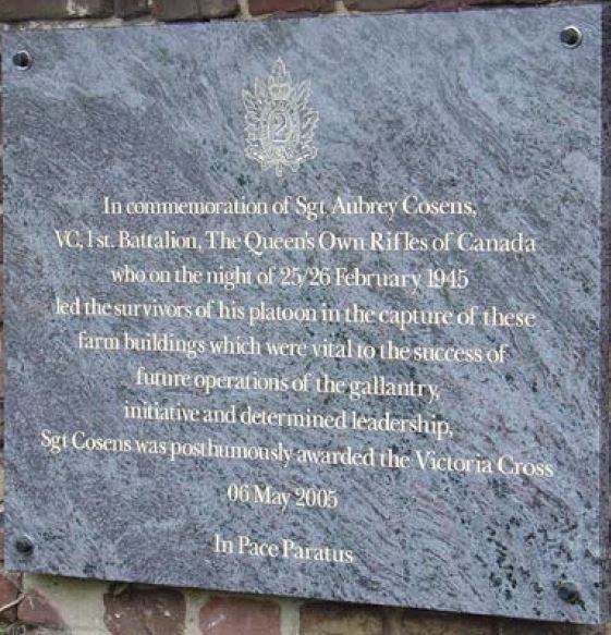 A granite plaque on the barn/house where Sergeant Aubrey Cosens performed the actions that earned him a Victoria Cross on the night of 25-26 February 1945. The current plaque dedicated on 6 May 2006 and replaced an earlier version.