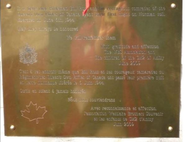 “It is here that Bill Ross and his courageous comrades of The Queen’s own Rifles of Canada spent their first night on Norman soil liberated on June 6th, 1944. May they always be honoured. We will remember them. With gratitude and affection, The WBS [Westlake Brothers Souvernir] Association and the children of the CM2 of Anisy, June, 2009.”