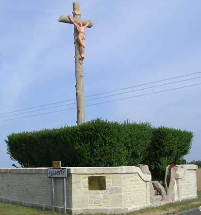 Copper plaque commemorating Rifleman Bill Ross and comrades who spent their first night in Normandy near this spot, after capturing the village. It is mounted on the wall surrounding a large crucifix which was there on 6 June 1944. Dedicated June 2009 in the presence of Bill Ross and family.