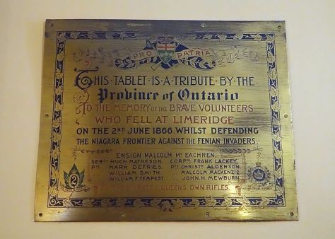 A plaque honouring the memories of the “Brave Volunteers” who fell at Limeridge, can be found inside the main entrance of the Provincial Legislative building in Queen’s Park, Toronto. It includes the names of the nine Queen’s Own Riflemen who died.
