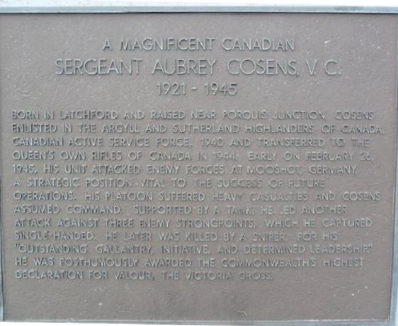 A bronze plaque commemorating Queen’s Own Rifles Sergeant Aubrey Cosens, VC, who was born in Latchford, Ontario.