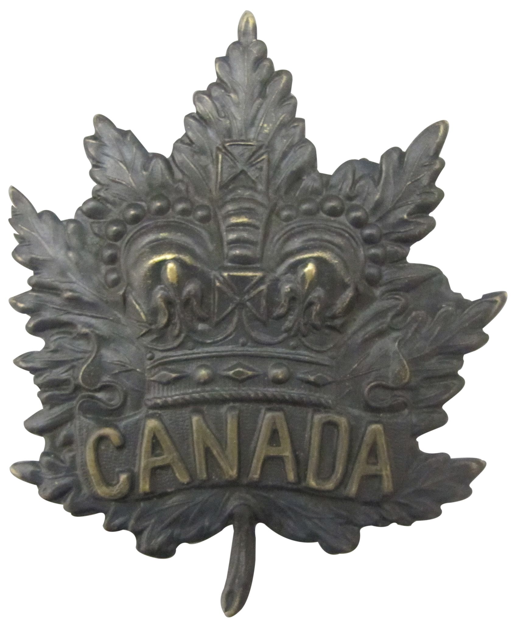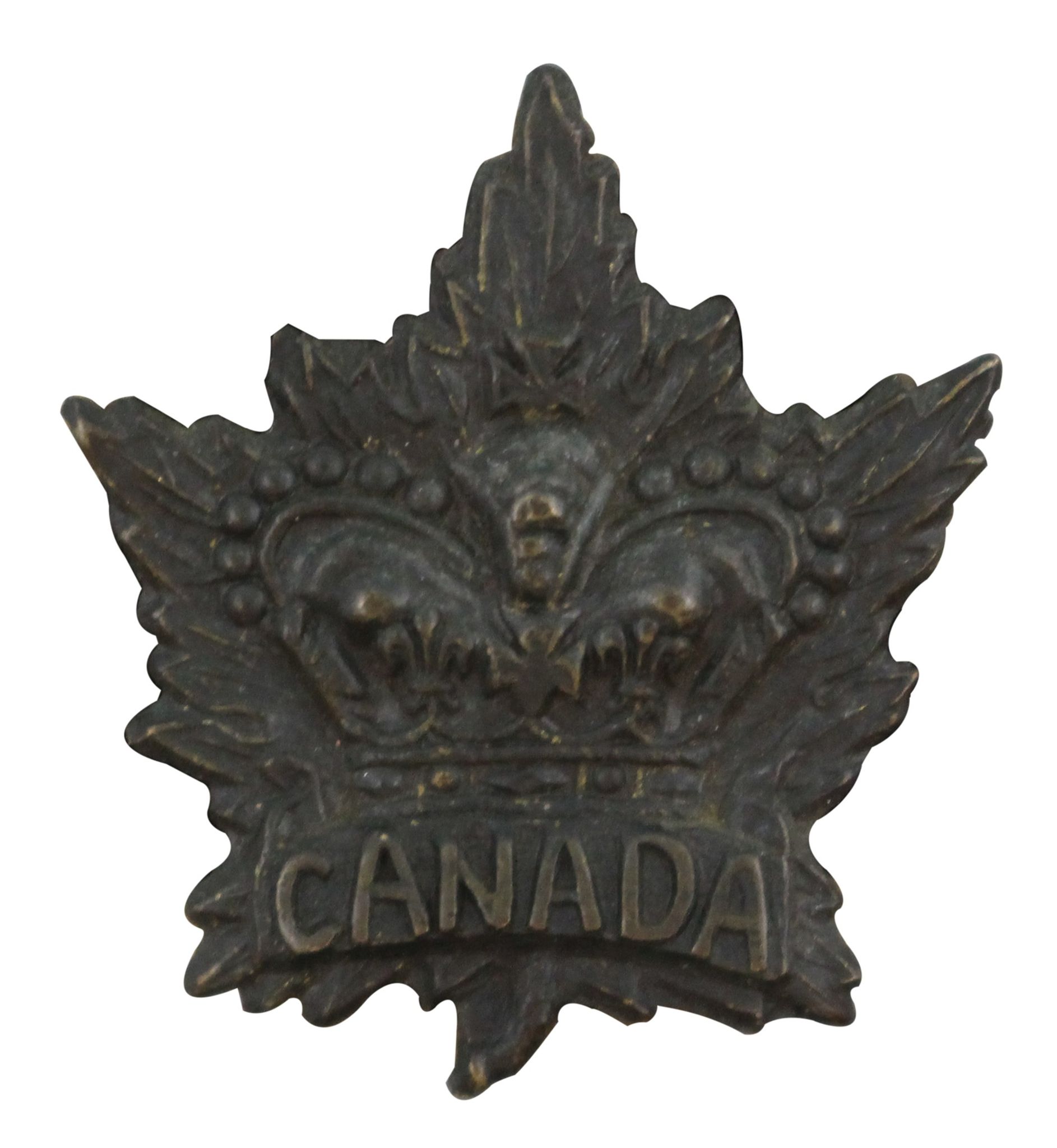 Cap badge of the battalion was “An oxidized “Maple Leaf” helmet plate and a pair of collar badges of the same design, but smaller.”