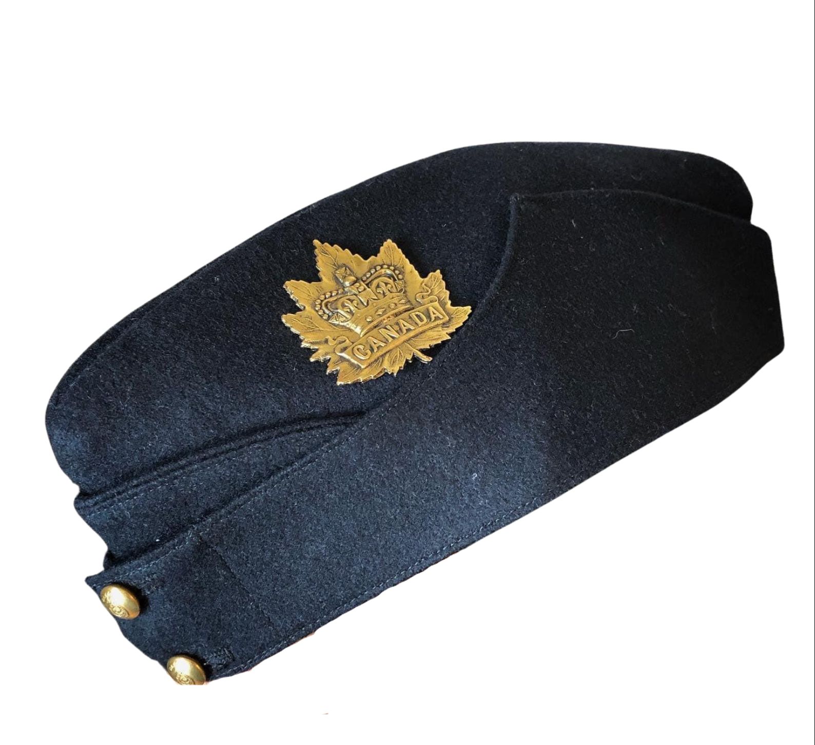 The undress cap worn by the Battalion was of the Dark Blue Field Service Cap. This cap would have two small brass Canada Militia buttons and the Canada maple leaf cap badge worn on the left side.