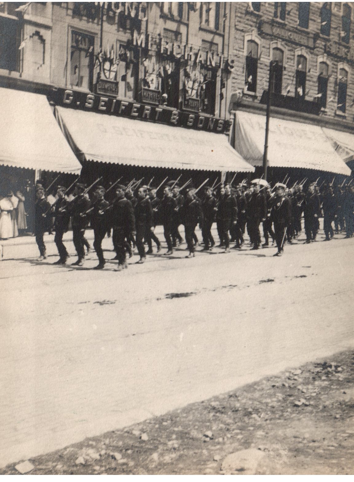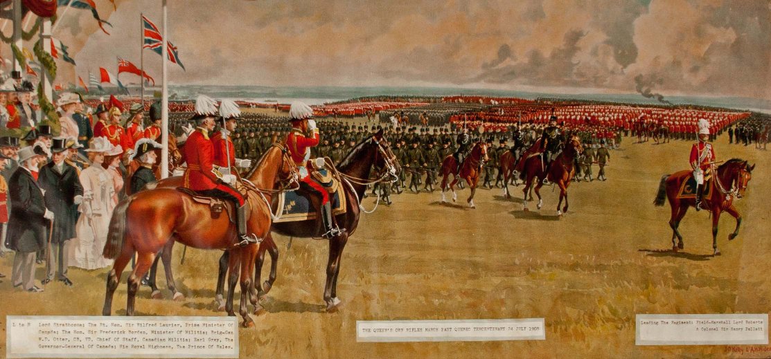 The outstanding event of 1908 was the Quebec Tercentenary. The three hundredth anniversary of the founding of Quebec by Champlain was to be celebrated in part by a huge military review, [over 13,000 soldiers]. H.R.H. the Prince of Wales, later King George V, was to take the salute. The Toronto Brigade, [QOR, 10th Royals, and 48th Highlanders], was invited and gladly accepted. The Queen’s Own had to be limited to one battalion of ten companies.