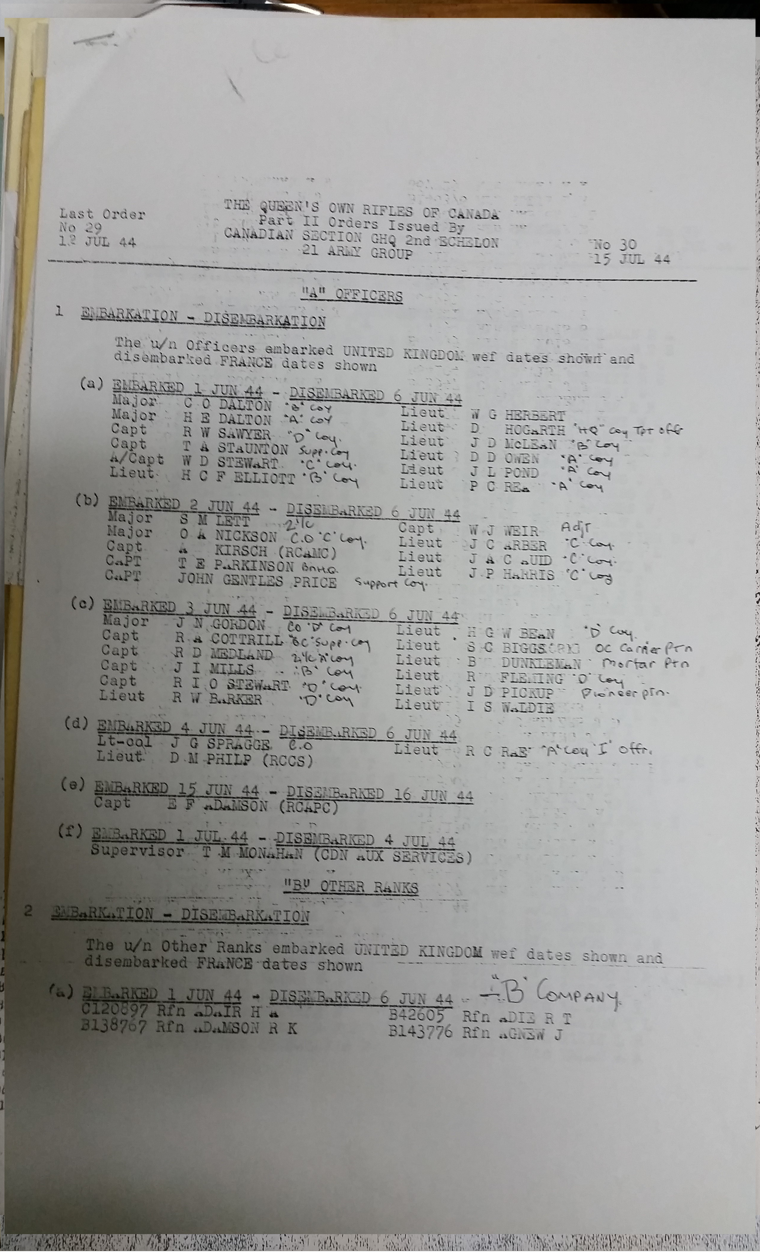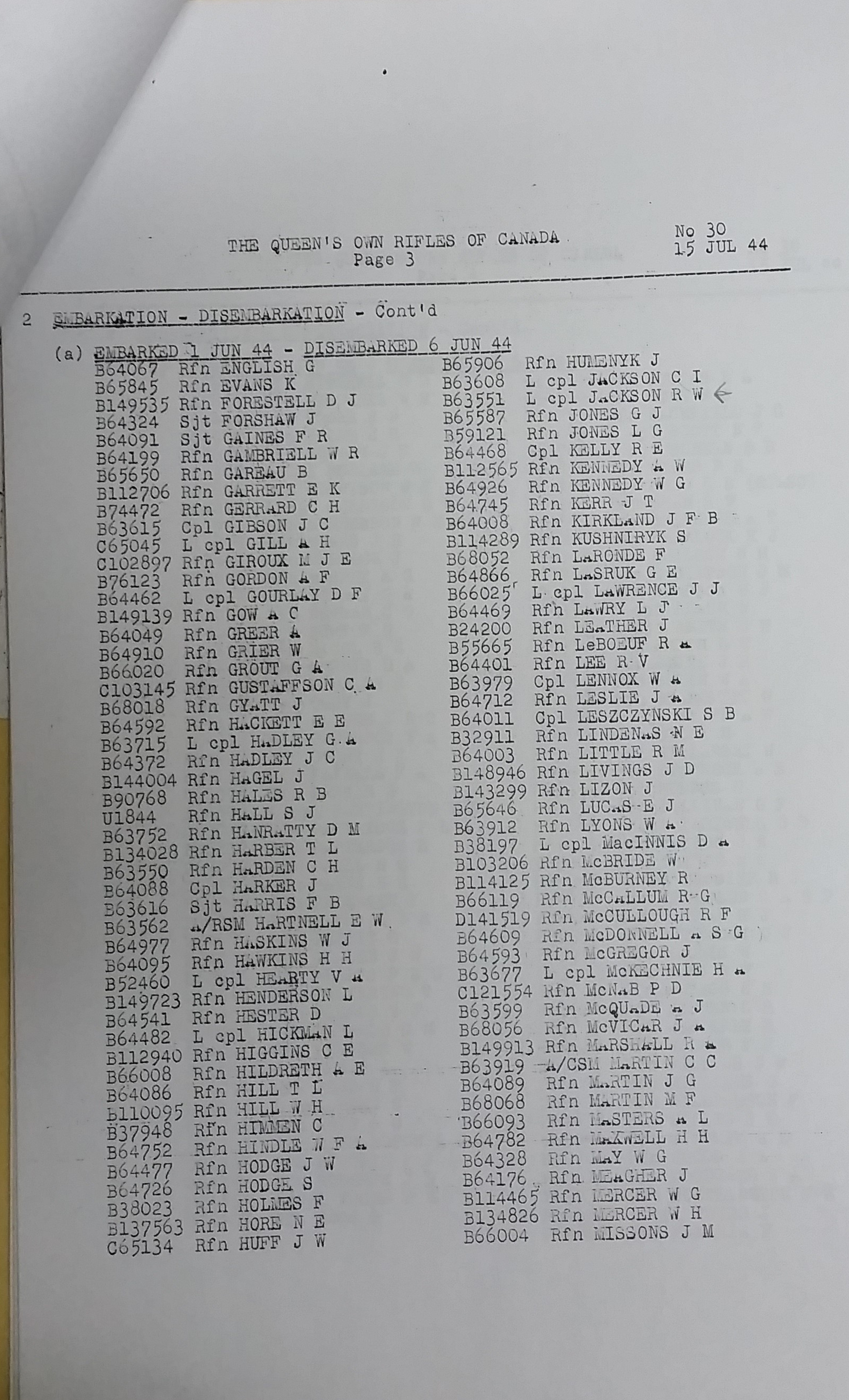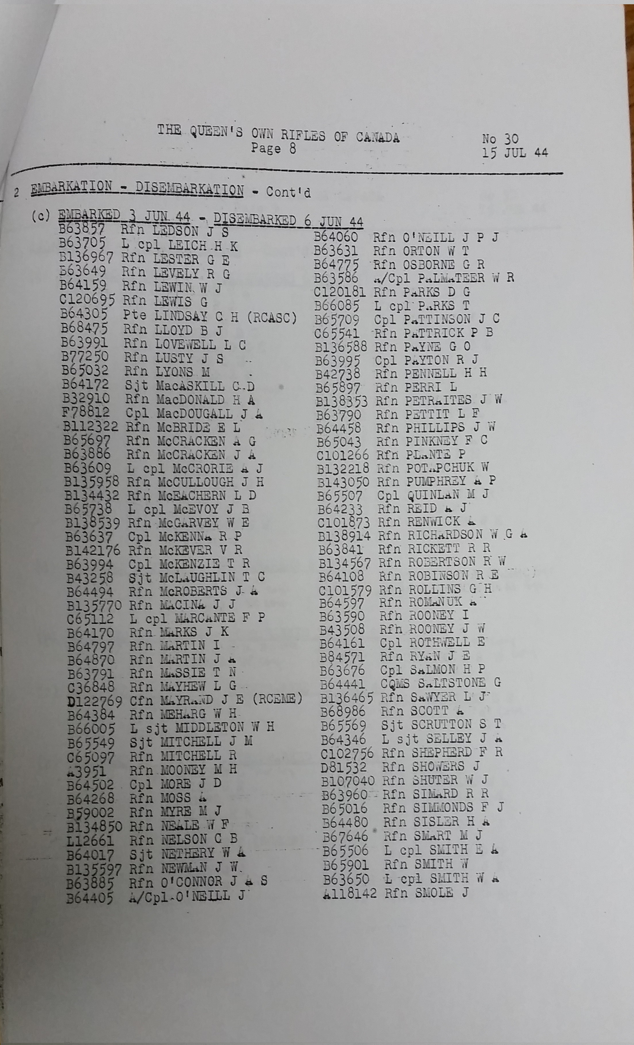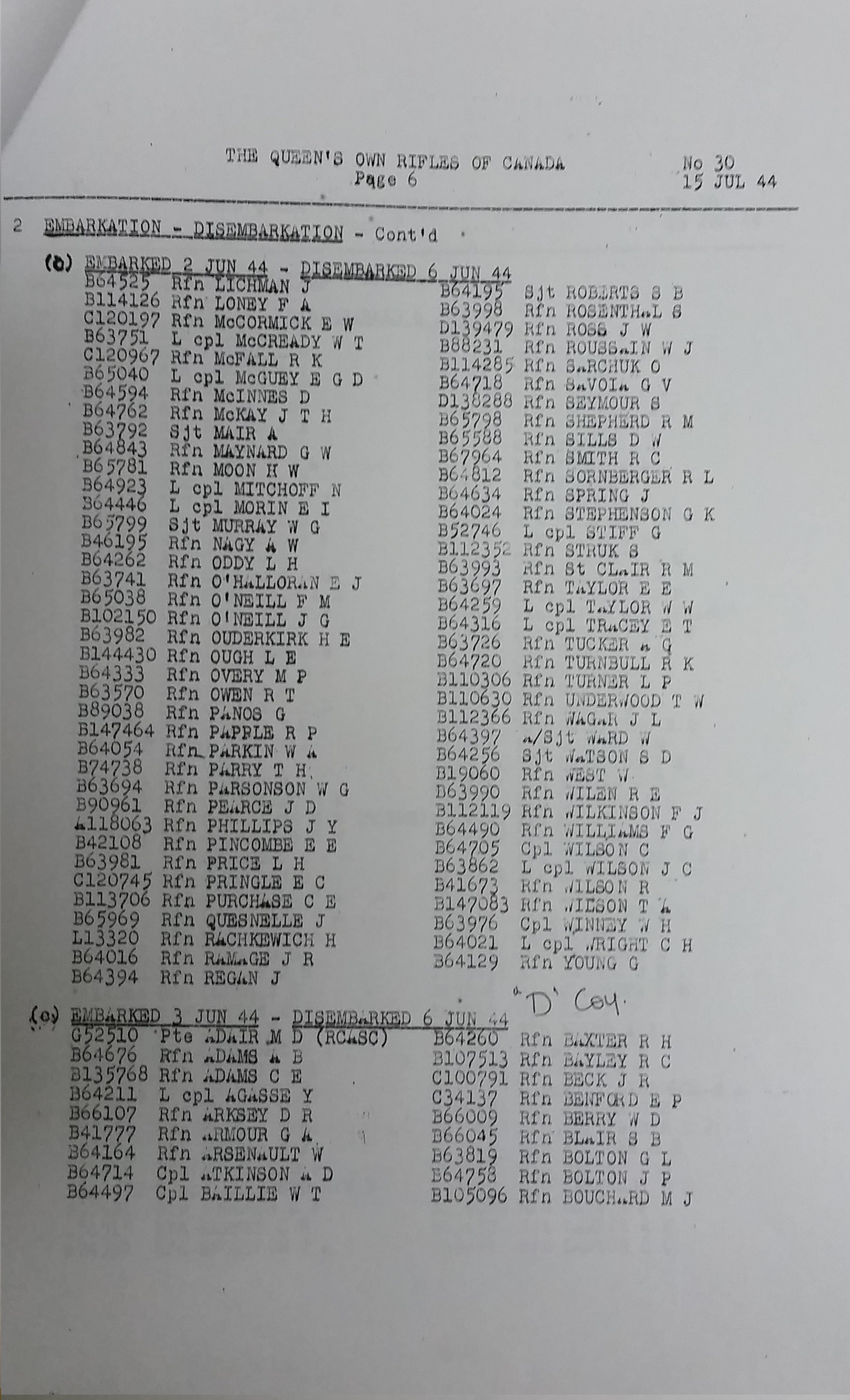 Below are images of the list of The QOR of C when each rifleman of the Regiment embarked from England to France. (Routine Order No. 30. 15 Jul 1944)