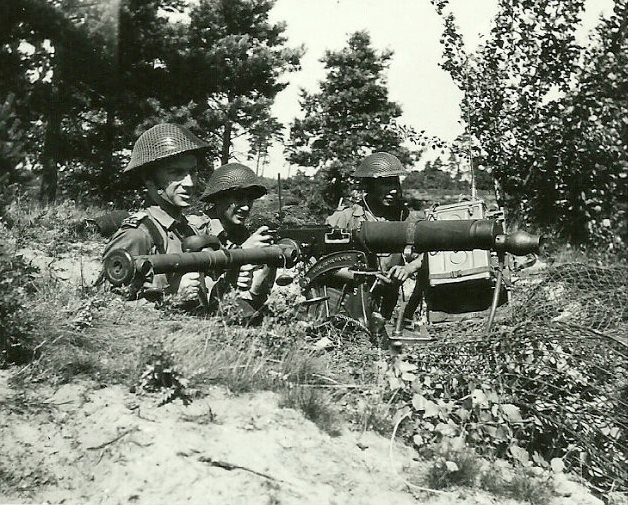 Vickers Machine Gun position during the 27CIB Live Firing Exercises at Putlos on the Baltic Sea, August 1952. 2nd Lieutenant Ken Ridge, QOR, Support Company on left holding what may be a range finder?, others unknown.