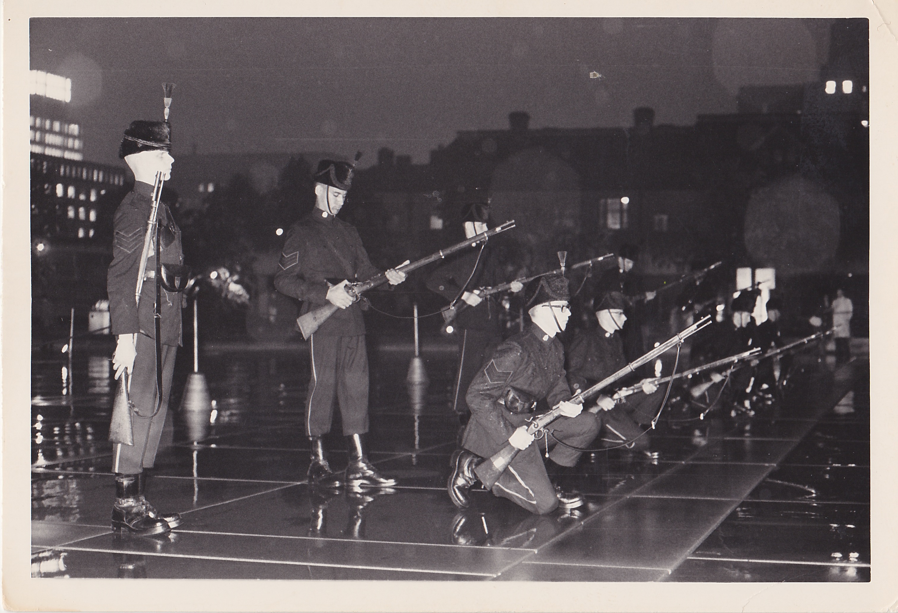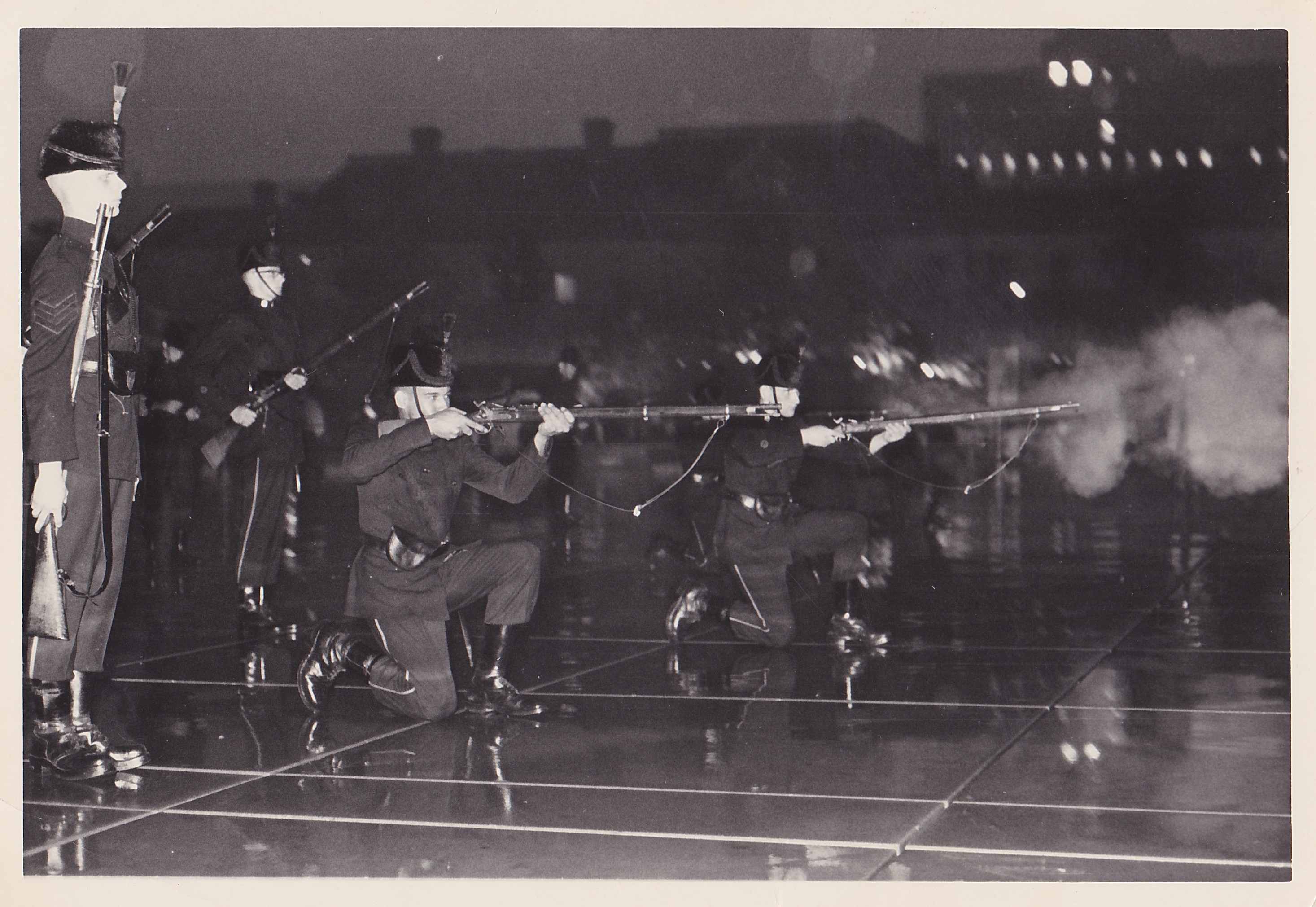 1st Battalion fires feu de joie on Victoria Day 1957 at Currie Barracks, Calgary, Alberta [Photo courtesy of Glenbow Museum NA-5600-6818a]