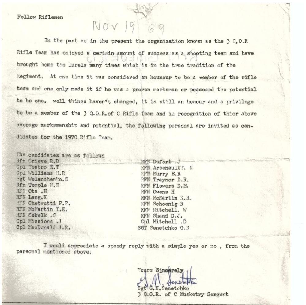 November 19 – Musketry Sergeant Senetchko sends out inviting select members to join the 3rd Bn Rifle Team: