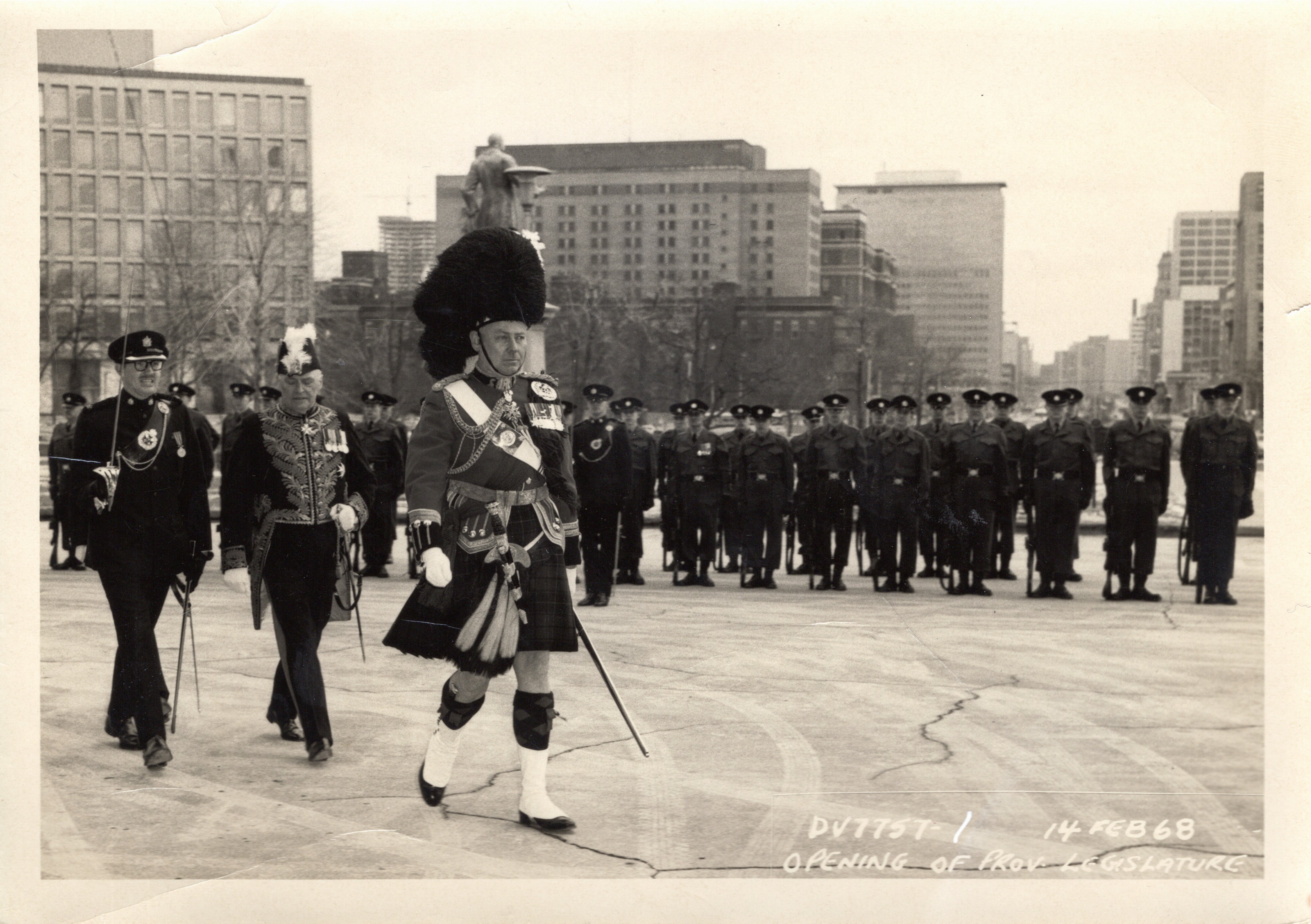 Norm McCracken escorts Lieutenant Governor Earl Rowe after inspecting the QOR Guard of Honour for the opening of the Ontario Legislature in February 1968.
