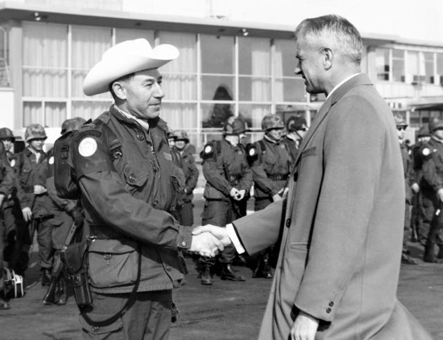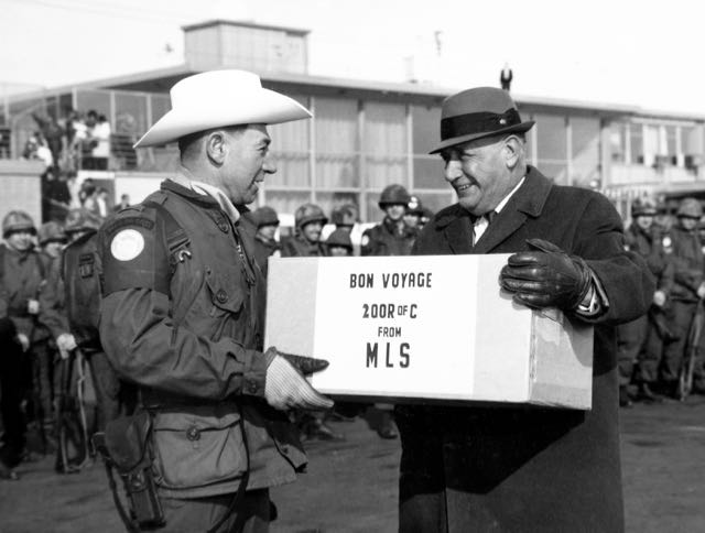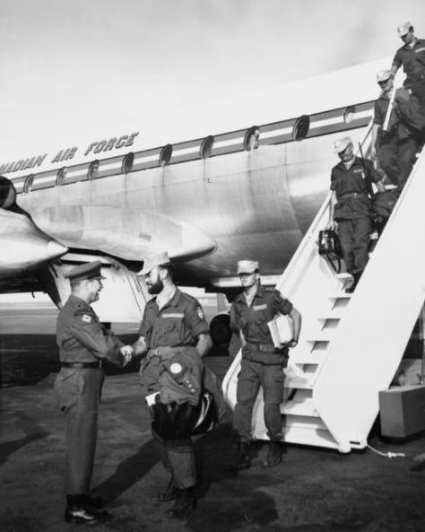 At McCall Field, the troops cleared Canada Customs and then marched single file through the waiting room to the tarmac to the stirring beat of the Lord Strathcona’s Horse (Royal Canadians) Band. On the tarmac, the Advance party formed up in three ranks for inspection by the Mayor of Calgary, His Worship Jack Leslie. The Mayor presented Col Robinson with an official Calgary White Stetson (which was immediately donned) and commenced his inspection, giving a farewell handshake to every soldier. At 1000 hours the giant Yukon’s wheels left the ground and the Advance party was Cyprus bound. The flight was routed via Trenton instead of taking the Polar Route to Shannon, Ireland since the RCAF had apparently left the 15-man advance party of the Royal Canadian Dragoons there before flying to Calgary.