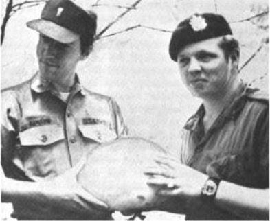 WHITE or dark meat Sergeant Prospects of eating of foreign object was initially unappetizing to Lieutenant Robert Benson left 98th Comm Gp as Sergeant Brain Budden of Queen’s Own Rifles presents giant puffball (Calvatia Ciganted.)