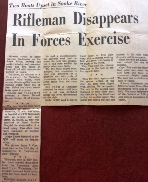 On 24 September 1969, a 1st Battalion watermanship exercise on the Sooke River went tragically wrong resulting in the injury of 4 soldiers from A Company and the death of Rifleman Harold Wayne George of Vancouver. The river had been considered safe when scouted earlier but was flooded by fresh rains at the time of the exercise.