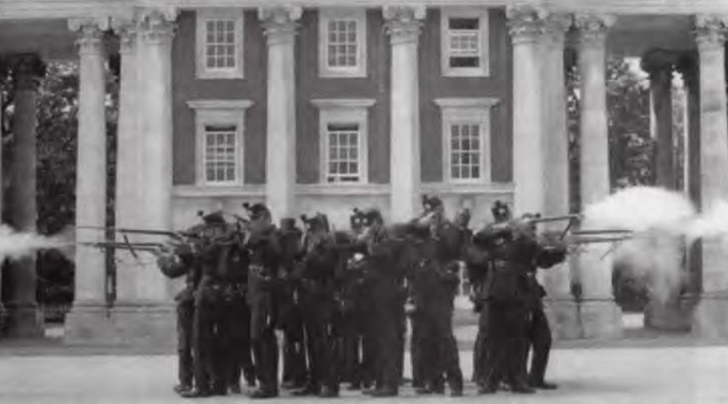 “The company headquarters entered the square through the arches of Long Block to a bugle fanfare. Bugler Phil ten Kortenaar sounded ‘Advance’ and the skirmisher company marched on in fours, rifles at the trail, and performed a series of maneuvres in accordance with Militia General Orders as well as the Field Exercise and Evolution of Infantry, dated 1862 -all at a rifles pace. Following a demonstration of sword bayonet drill, the company reformed and halted at the left edge of the parade square in preparation for a display on modes of firing. After the company advanced, extended, and commenced firing, all on bugle calls, it was halted and ordered to form a square where a volley was delivered and then the skirmish line was reformed.
