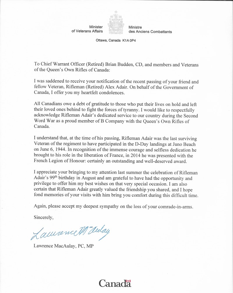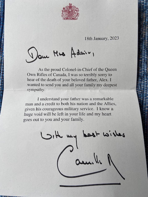Alex was the last known QOR D-Day veteran when he passed away in his 100th year, at the Golden Plough Lodge in Cobourg, Ontario, on 24 December 2022. His remains were cremated and deposited in Christ Church Anglican Cemetery in Tamworth, Ontario.
