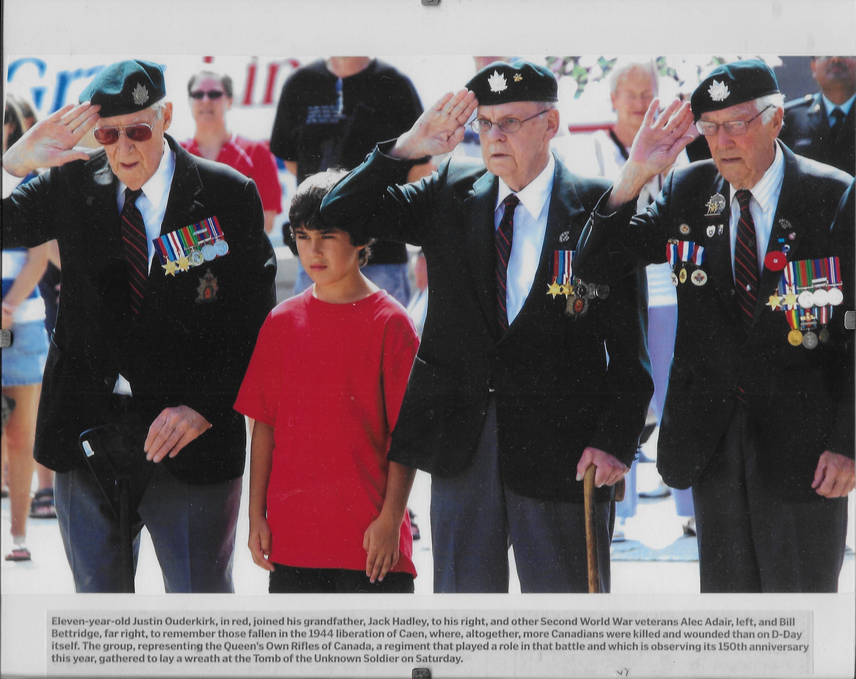 After boarding a transport ship on 1 June, Alex landed with B Company in the first wave at Juno Beach on D-Day, 6 June 1944. A photo taken in front of what is now called Canada House, just minutes after landing, is well-known regimentally (see header above – second rifleman from the left), and he talks about what led to that photo in the short video below.