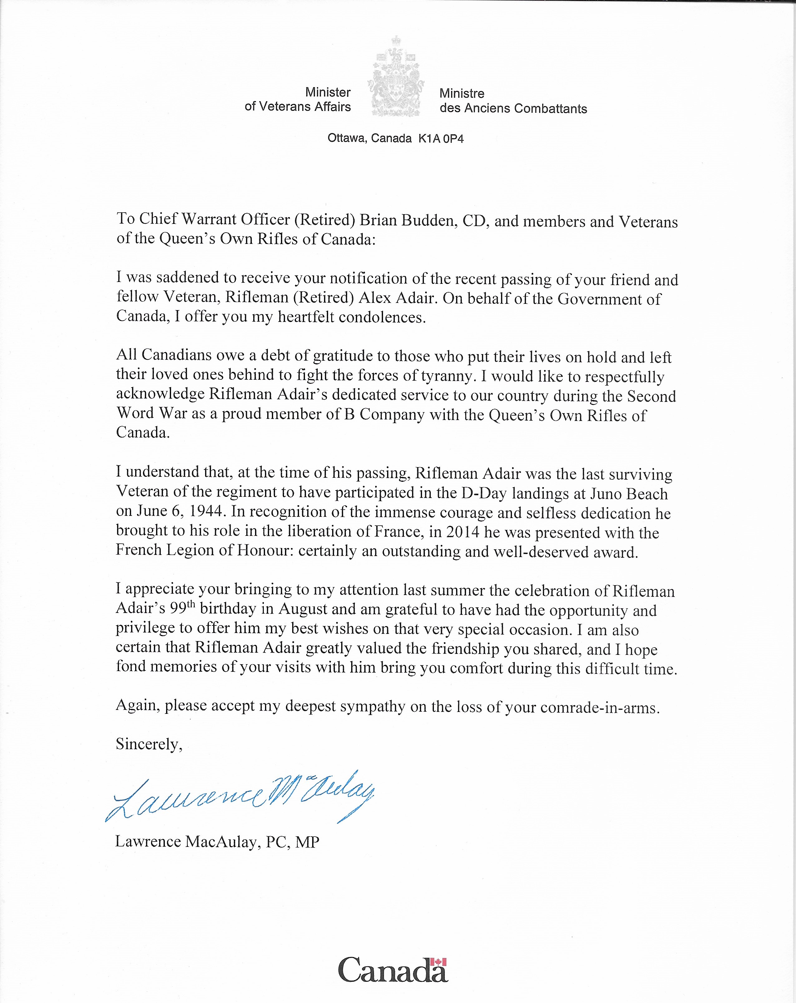 Alex was the last known QOR D-Day veteran when he passed away in his 100th year, at the Golden Plough Lodge in Cobourg, Ontario, on 24 December 2022. His remains were cremated and deposited in Christ Church Anglican Cemetery in Tamworth, Ontario.