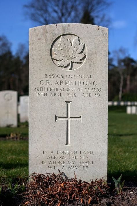 Armstrong embarked for England on 29 December 1942 as a reinforcement to the QOR 1st Battalion. However, after a stay in hospital, he was taken on strength by the 48th Highlanders on 6 April 1944.