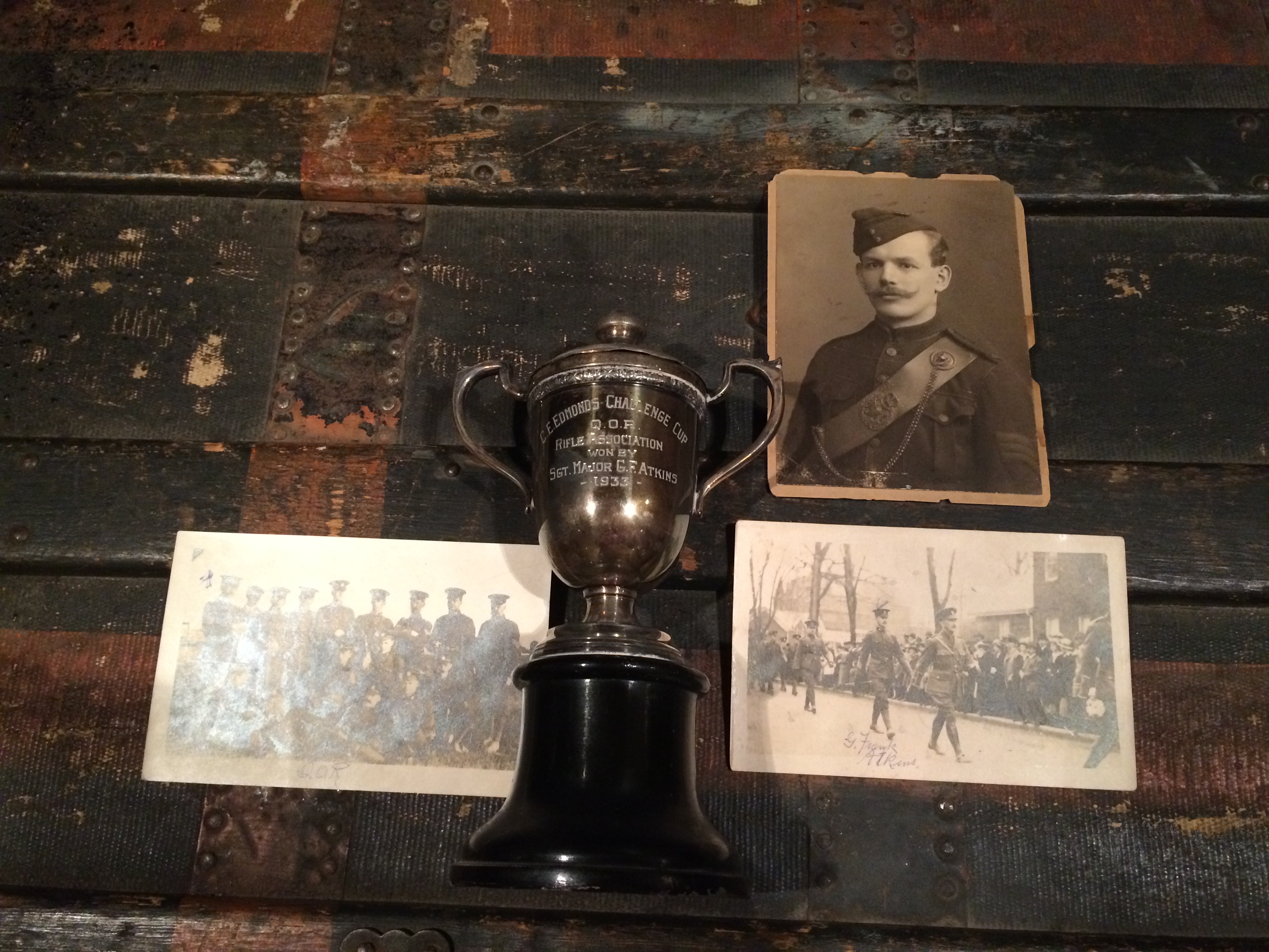 G Frank Atkins was a founding member of the Maple Leaf Club which still [2017] encourages shooting and camaraderie among members and ex members of the Regiment by holding an annual shooting match and dinner. Atkins, sometimes referred to as “Brandy Atkins” was the secretary/treasurer from 1912 until his death in 1956. His 1933 shooting trophy, (seen below), was later used as an award to the best shot of the club.