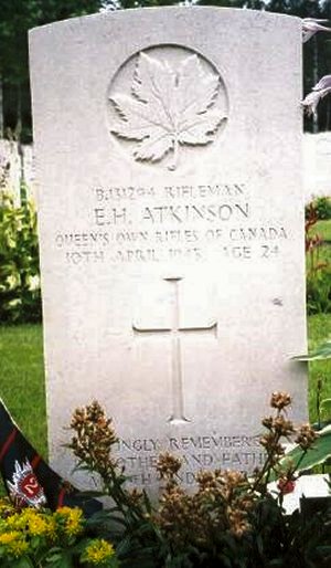 Rifleman Atkinson was killed in action in the Netherlands on 10 April 1945, aged 24. He is buried in the Holten Canadian War Cemetery, grave reference II. A. 3. His family had the following engraved on his marker: