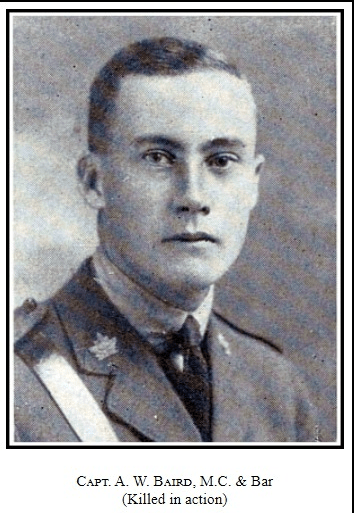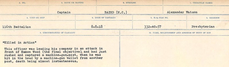 Baird was killed in action at Amiens on 8 August 1918. He is buried at Hourges Orchard Cemetery, Domart-sur-la-Luce, Somme, France, Grave Reference: A. 43A.