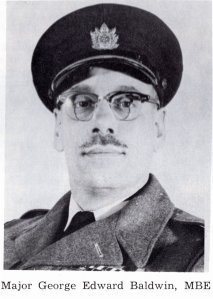 Major George Edward Baldwin, MBE was born in Belleville, Ontario in 1919. He was educated at Queen Alexandra School and Belleville Collegiate, and enlisted in the Hastings and Prince Edward Regiment as a 2nd Lieutenant in November 1941. He joined the regiment in England in December 1942, saw service in Italy and North West Europe, and was awarded the MBE. IN 1944 he was appointed adjutant and served in that capacity until his return to Canada in 1945.