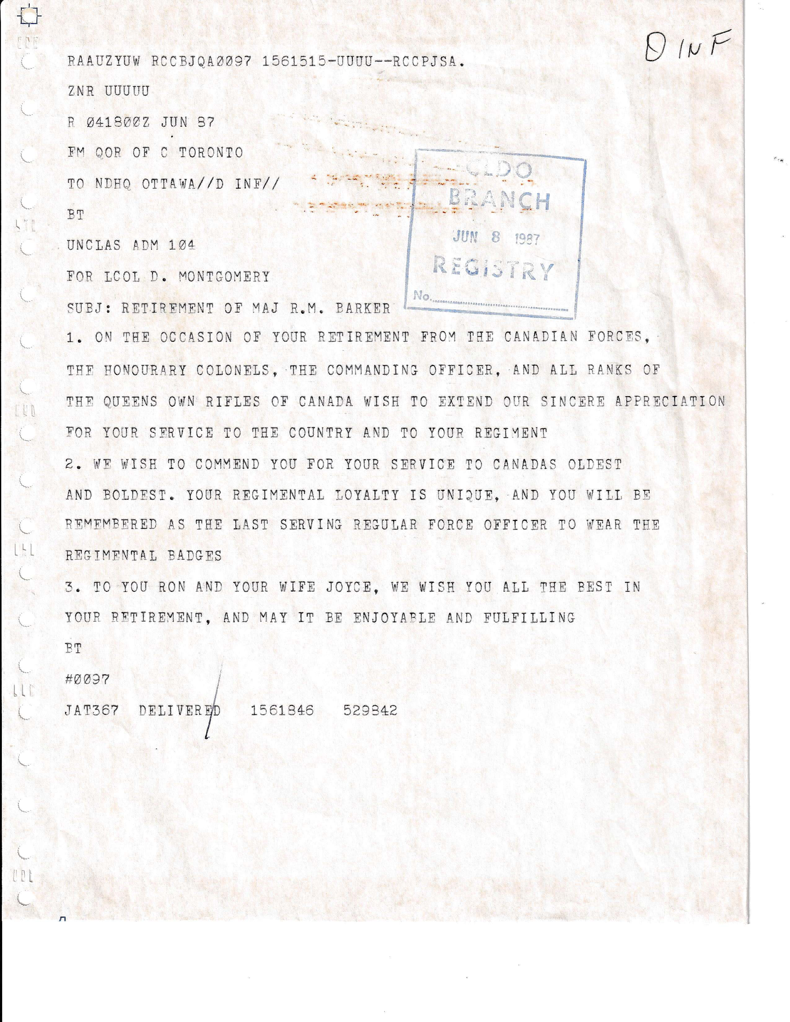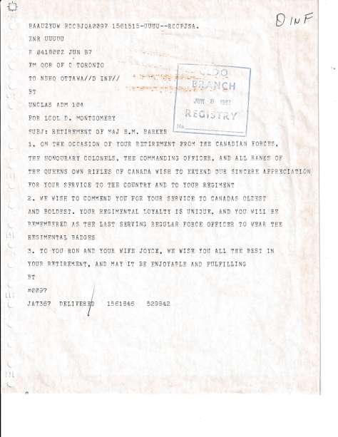 At the time of his retirement from the Canadian Forces in June 1987, Major Ronald M. Barker, CD was the last serving regular Force officer to wear the Queen’s Own Rifles’ (QOR) regimental badges. He received both a congratulatory telex (see below) and a commemorative silver tray advising him that he would be remembered for this distinction.