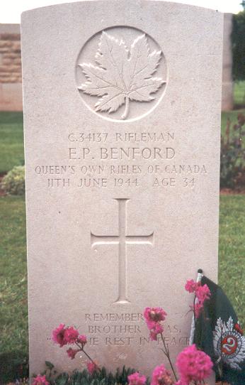 Rifleman Benford was killed in action during the battle for Le Mesnil Patry on 11 June 1944, aged 34. He is buried in Beny-sur-Mer Canadian War Cemetery, grave reference III. B. 3.