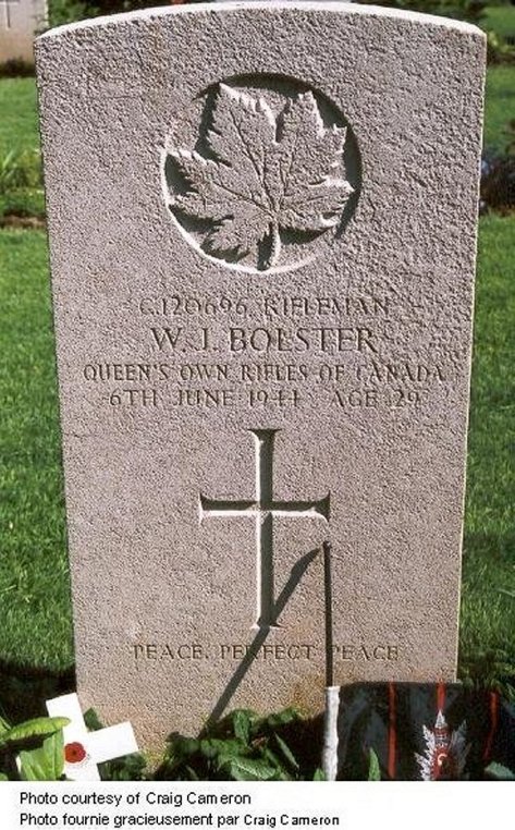 Bolster was killed in action on 6 June 1944 while landing on Juno Beach. He is buried in Beny-sur-Mer Canadian War Cemetery, Grave Reference: I. G. 4.