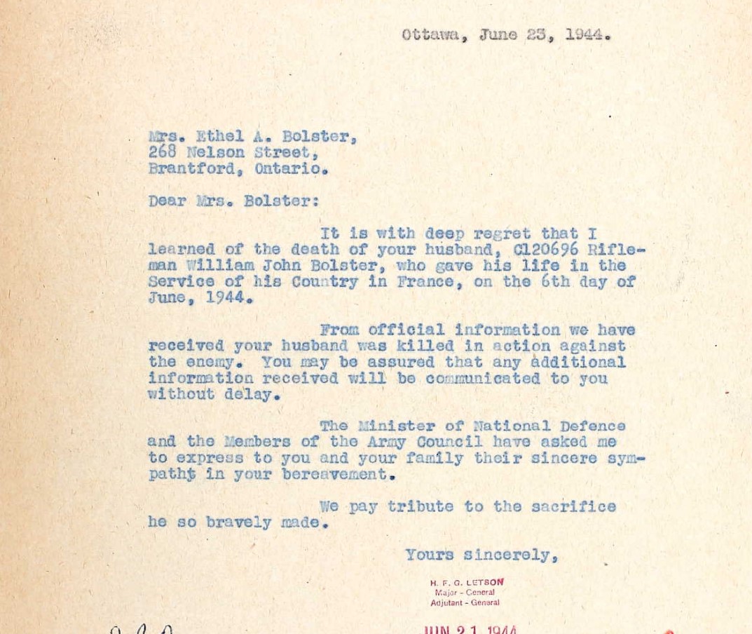 Bolster was killed in action on 6 June 1944 while landing on Juno Beach. He is buried in Beny-sur-Mer Canadian War Cemetery, Grave Reference: I. G. 4.