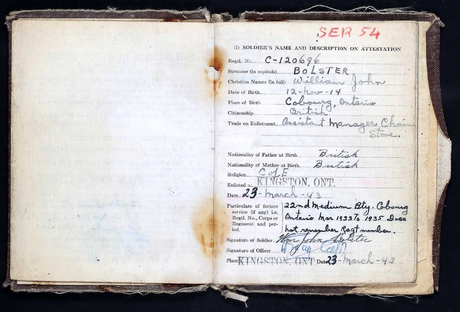 Bolster was living in Peterborough and working as an Assistant Manager of a variety chain store when enlisted as a Gunner in Kingston, Ontario on March 23, 1943. He had previous service in the 22nd Medium Battery based in Cobourg.