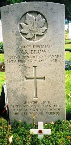 Rifleman Brown was killed in action in Mooshof, Germany on 26 February 1945 and is buried in Groesbeek Canadian War Cemetery, grave reference VIII. D. 9.