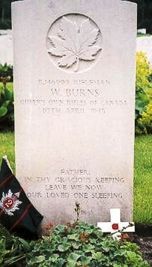 Rifleman Burns, aged 20, was killed in action in the Netherlands on 10 April 1945 and is buried in Holten Canadian War Cemetery, grave reference II. A. 11. His family had the following engraved on his marker: