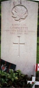 Lance Corporal Cholette, aged 20, was killed in action in the Netherlands on 23 April 1945. He is buried in Holten Canadian War Cemetery, grave reference XI. G. 9.
