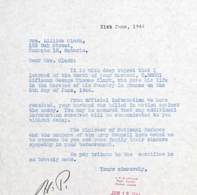 Clark was working as a baker at Weston Biscuits when he enlisted with the 48th Highlanders on June 4, 1940, in Toronto, Ontario. After various training and postings, he arrived in the United Kingdom on 20 September 1943. On 17 December 1943, he was posted to The Queen’s Own Rifles from a reinforcement unit.