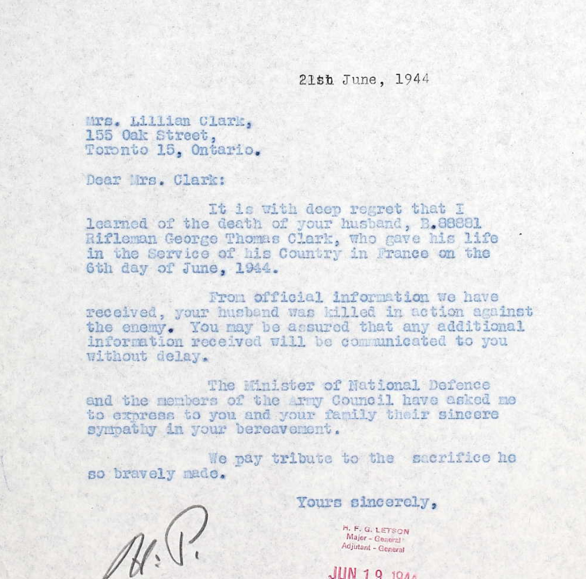 Clark landed with B Company in the first wave of D-Day, on 6 June 1944, and was killed in action. He is buried in Beny-sur-Mer Canadian War Cemetery, grave reference I. C. 9.