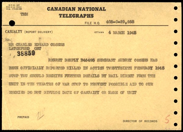 Casualty Telegram sent March 4, 1945Photo by the late Captain Geoff Winnington-BallThis photo was taken by Captain Craig Cameron in June 2000. The medals of Sergeant Cosens and his portrait are on display at the Queen’s Own Rifles of Canada Regimental Museum, at Casa Loma in Toronto. The Victoria Cross in the collection is a replica.