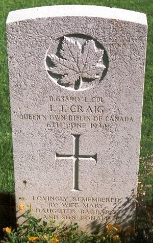 Craig landed on Juno Beach with B Company on the first wave of D-Day, 6 June 1944, and was killed in action. He is buried in Beny-sur-Mer Canadian War Cemetery, grave reference I. G. 6. The epitaph chosen by the family reads:
